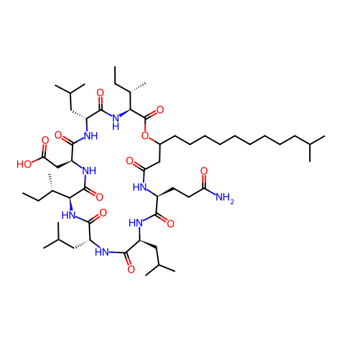 | SMILES | CC[C@H](C)[C@H]1C(=O)N[C@H](C(=O)N[C@@H](C(=O)N[C@H](C(=O)OC(CC(=O)N[C@H](C(=O)N[C@H](C(=O)N[C@@H](C(=O)N1)CC(C)C)CC(C)C)CCC(=O)N)CCCCCCCCCC(C)C)[C@@H](C)CC)CC(C)C)CC(=O)O |