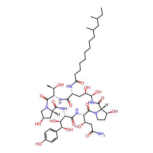 | SMILES | CCC(C)CC(C)CCCCCCCCC(=O)N[C@@H]1C[C@@H](O)[C@@H](O)NC(=O)[C@@H]2[C@@H](O)CCN2C(=O)[C@H]([C@H](O)CC(N)=O)NC(=O)[C@H]([C@H](O)[C@@H](O)C2=CC=C(O)C=C2)NC(=O)[C@@H]2C[C@@H](O)CN2C(=O)[C@H]([C@@H](C)O)NC1=O |