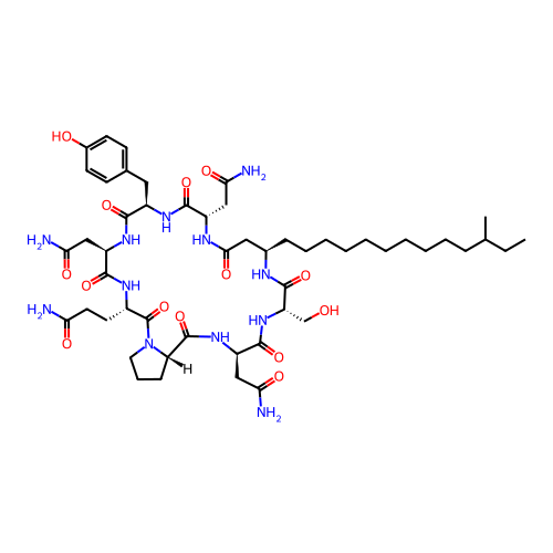 | SMILES | CCC(C)CCCCCCCCCC[C@@H]1CC(=O)N[C@H](C(=O)N[C@@H](C(=O)N[C@@H](C(=O)N[C@H](C(=O)N2CCC[C@H]2C(=O)N[C@@H](C(=O)N[C@H](C(=O)N1)CO)CC(=O)N)CCC(=O)N)CC(=O)N)CC3=CC=C(C=C3)O)CC(=O)N |