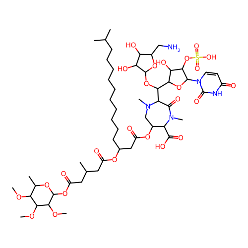 | SMILES | CC1C(C(C(C(O1)OC(=O)CC(C)CC(=O)OC(CCCCCCCCCCC(C)C)CC(=O)OC2CN(C(C(=O)N(C2C(=O)O)C)C(C3C(C(C(O3)N4C=CC(=O)NC4=O)OS(=O)(=O)O)O)OC5C(C(C(O5)CN)O)O)C)OC)OC)OC |
