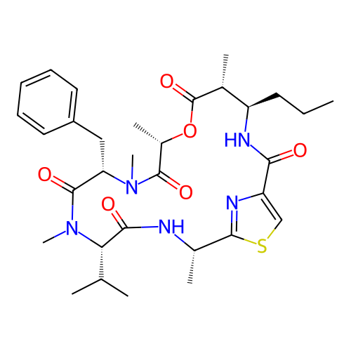 | SMILES | CCC[C@@H]1[C@H](C(=O)O[C@H](C(=O)N([C@H](C(=O)N([C@H](C(=O)N[C@H](C2=NC(=CS2)C(=O)N1)C)C(C)C)C)CC3=CC=CC=C3)C)C)C |
