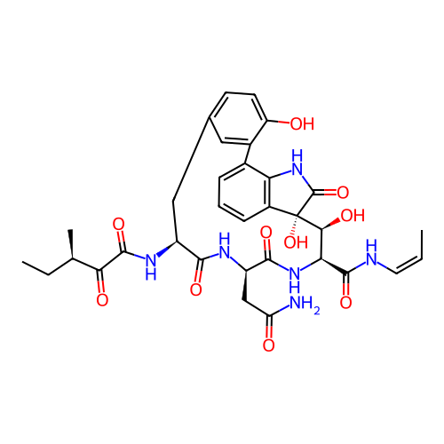 | SMILES | CC[C@@H](C)C(=O)C(=O)N[C@H]1CC2=CC(=C(C=C2)O)C3=C4C(=CC=C3)[C@]([C@H]([C@H](NC(=O)[C@H](NC1=O)CC(=O)N)C(=O)N/C=C\C)O)(C(=O)N4)O |