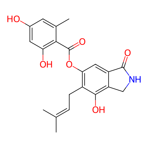 | SMILES | CC1=CC(=CC(=C1C(=O)OC2=C(C(=C3CNC(=O)C3=C2)O)CC=C(C)C)O)O |