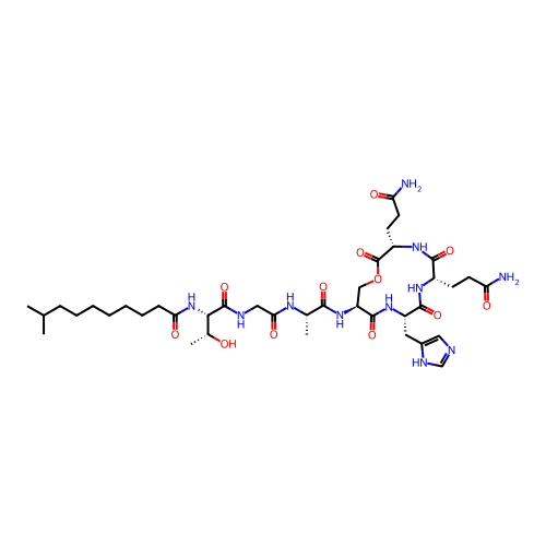 | SMILES | C[C@H]([C@@H](C(=O)NCC(=O)N[C@@H](C)C(=O)N[C@H]1COC(=O)[C@@H](NC(=O)[C@@H](NC(=O)[C@@H](NC1=O)CC2=CN=CN2)CCC(=O)N)CCC(=O)N)NC(=O)CCCCCCCC(C)C)O |