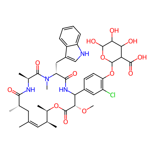 | SMILES | C[C@H]1C/C(=C\[C@@H]([C@H](OC(=O)[C@H](C(NC(=O)[C@H](N(C(=O)[C@@H](NC1=O)C)C)CC2=CNC3=CC=CC=C32)C4=CC(=C(C=C4)OC5C(C(C(C(O5)O)O)O)C(=O)O)Cl)OC)C)C)/C |