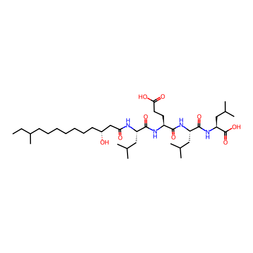 | SMILES | CCC(C)CCCCCCC[C@H](CC(=O)N[C@@H](CC(C)C)C(=O)N[C@@H](CCC(=O)O)C(=O)N[C@@H](CC(C)C)C(=O)N[C@@H](CC(C)C)C(=O)O)O |