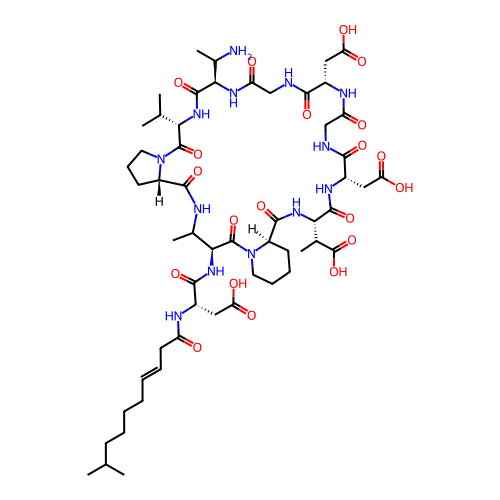| SMILES | CC1[C@@H](C(=O)N2CCCC[C@@H]2C(=O)N[C@H](C(=O)N[C@H](C(=O)NCC(=O)N[C@H](C(=O)NCC(=O)N[C@@H](C(=O)N[C@H](C(=O)N3CCC[C@H]3C(=O)N1)C(C)C)C(C)N)CC(=O)O)CC(=O)O)C(C)C(=O)O)NC(=O)[C@H](CC(=O)O)NC(=O)CC=CCCCCC(C)C |