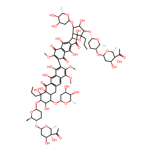 | SMILES | CCCC1(C(C(C(C2C1(C(=O)C3=C(C2)C=C4C(=C3O)C(=C(C(=C4OC)OC)C5=C(C(=O)C6=C(C5=O)C(=C7C(=C6O)C8C9C(C(C(C(C9(C7=O)O)(O8)CCC)O[C@H]1CC[C@@H]([C@H](O1)C)O[C@@H]1C[C@@H]([C@@]([C@H](O1)C)(C(=O)C)O)O)O)OC1C[C@H]([C@H]([C@@H](O1)C)O)O)O)OC)O)O)O[C@H]1C[C@H]([C@H]([C@@H](O1)C)O)O)O)O[C@H]1CC[C@@H]([C@H](O1)C)O[C@@H]1C[C@@H]([C@@]([C@H](O1)C)(C(=O)C)O)O)O |