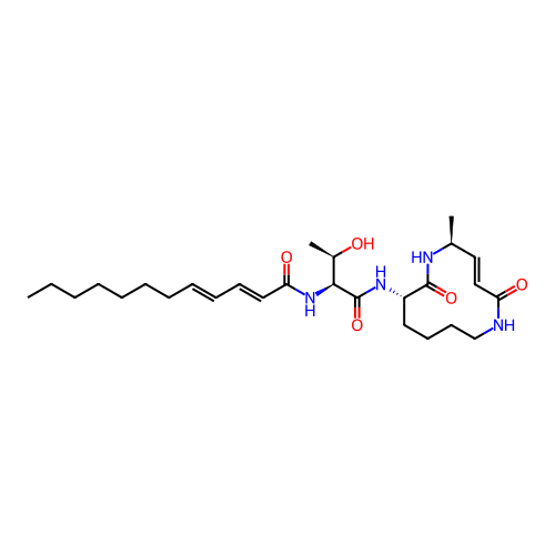 | SMILES | CCCCCCC/C=C/C=C/C(=O)N[C@@H]([C@@H](C)O)C(=O)N[C@H]1CCCCNC(=O)/C=C/[C@@H](NC1=O)C |