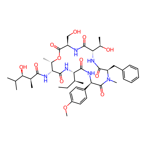 | SMILES | CC[C@H](C)[C@H]1C(=O)N[C@@H](C(=O)N([C@@H](C(=O)N[C@H](C(=O)N[C@@H](C(=O)O[C@H]([C@H](C(=O)N1)NC(=O)[C@@H](C)[C@@H](C(C)C)O)C)CO)[C@@H](C)O)CC2=CC=CC=C2)C)C3=CC=C(C=C3)OC |