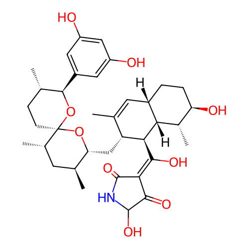 | InChI | InChI=1S/C36H49NO9/c1-16-8-9-36(46-33(16)22-12-23(38)14-24(39)13-22)19(4)10-18(3)27(45-36)15-25-17(2)11-21-6-7-26(40)20(5)28(21)29(25)31(41)30-32(42)35(44)37-34(30)43/h11-14,16,18-21,25-29,33,35,38-41,44H,6-10,15H2,1-5H3,(H,37,43)/t16-,18-,19-,20-,21-,25+,26+,27+,28-,29-,33-,35?,36+/m0/s1 |