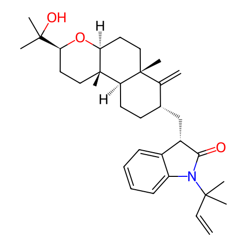 | InChI | InChI=1S/C33H47NO3/c1-9-30(3,4)34-25-13-11-10-12-23(25)24(29(34)35)20-22-14-15-26-32(7,21(22)2)18-17-28-33(26,8)19-16-27(37-28)31(5,6)36/h9-13,22,24,26-28,36H,1-2,14-20H2,3-8H3/t22-,24-,26+,27-,28-,32+,33-/m0/s1 |