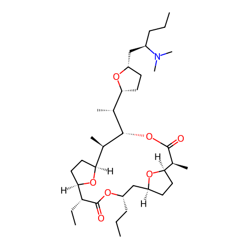 | InChI | InChI=1S/C36H63NO7/c1-9-12-25(37(7)8)20-27-14-16-30(40-27)22(4)34-23(5)31-18-19-33(43-31)29(11-3)36(39)42-26(13-10-2)21-28-15-17-32(41-28)24(6)35(38)44-34/h22-34H,9-21H2,1-8H3/t22-,23-,24+,25-,26+,27+,28+,29-,30-,31+,32-,33-,34+/m1/s1 |
