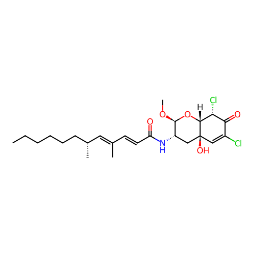 | SMILES | CCCCCC[C@@H](C)/C=C(\C)/C=C/C(=O)N[C@H]1C[C@]2(C=C(C(=O)[C@H]([C@H]2O[C@@H]1OC)Cl)Cl)O |