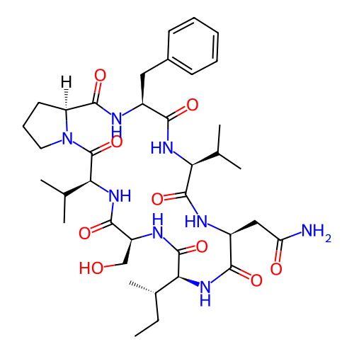 | SMILES | CC[C@H](C)[C@H]1C(=O)N[C@H](C(=O)N[C@H](C(=O)N2CCC[C@H]2C(=O)N[C@H](C(=O)N[C@H](C(=O)N[C@H](C(=O)N1)CC(=O)N)C(C)C)CC3=CC=CC=C3)C(C)C)CO |