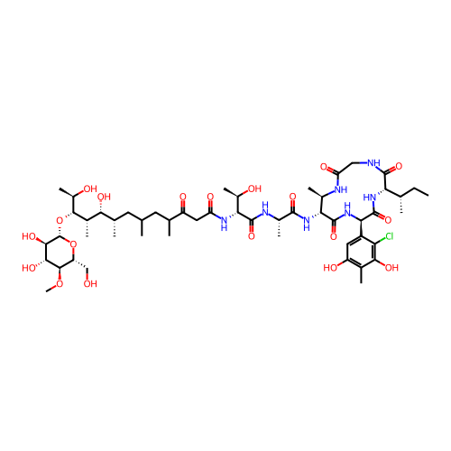| SMILES | CC[C@H](C)[C@H]1C(=O)NCC(=O)N[C@@H]([C@H](C(=O)N[C@@H](C(=O)N1)C2=CC(=C(C(=C2Cl)O)C)O)NC(=O)[C@H](C)NC(=O)[C@@H]([C@@H](C)O)NC(=O)CC(=O)C(C)CC(C)C[C@H](C)[C@H]([C@H](C)[C@@H]([C@@H](C)O)O[C@H]3[C@@H]([C@H]([C@@H]([C@H](O3)CO)OC)O)O)O)C |