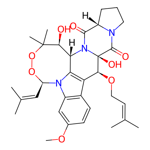 | SMILES | CC(=CCO[C@H]1C2=C3[C@H]([C@@H](C(OO[C@@H](N3C4=C2C=CC(=C4)OC)C=C(C)C)(C)C)O)N5[C@@]1(C(=O)N6CCC[C@H]6C5=O)O)C |