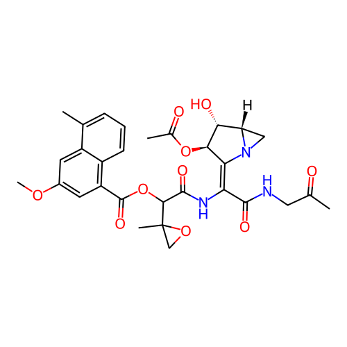 | InChI | InChI=1S/C30H33N3O10/c1-14-7-6-8-18-19(14)9-17(40-5)10-20(18)29(39)43-26(30(4)13-41-30)28(38)32-22(27(37)31-11-15(2)34)23-25(42-16(3)35)24(36)21-12-33(21)23/h6-10,21,24-26,36H,11-13H2,1-5H3,(H,31,37)(H,32,38)/b23-22+/t21-,24+,25+,26?,30?,33?/m0/s1 |