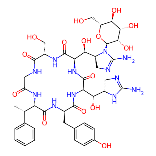 | SMILES | C[C@H]([C@H]1C(=O)N[C@@H](C(=O)NC(C(=O)N[C@@H](C(=O)N[C@H](C(=O)NCC(=O)N1)CO)[C@H]([C@@H]2CN=C(N2[C@@H]3[C@H]([C@H]([C@@H]([C@H](O3)CO)O)O)O)N)O)[C@H]([C@@H]4CN=C(N4)N)O)CC5=CC=C(C=C5)O)C6=CC=CC=C6 |
