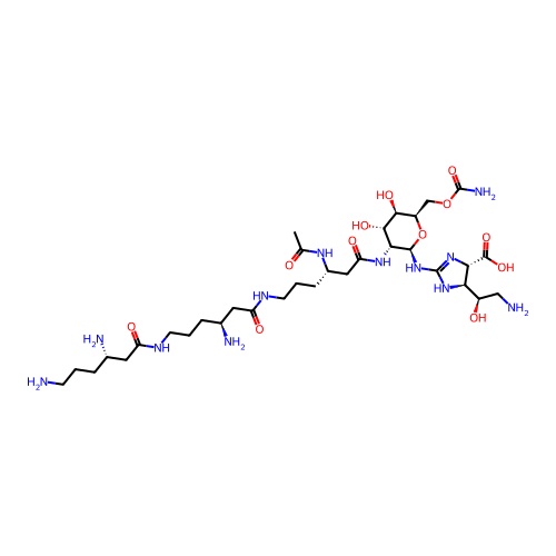 | SMILES | CC(=O)N[C@@H](CCCNC(=O)C[C@H](CCCNC(=O)C[C@H](CCCN)N)N)CC(=O)N[C@@H]1[C@@H]([C@H]([C@H](O[C@H]1NC2=N[C@@H]([C@H](N2)[C@@H](CN)O)C(=O)O)COC(=O)N)O)O |