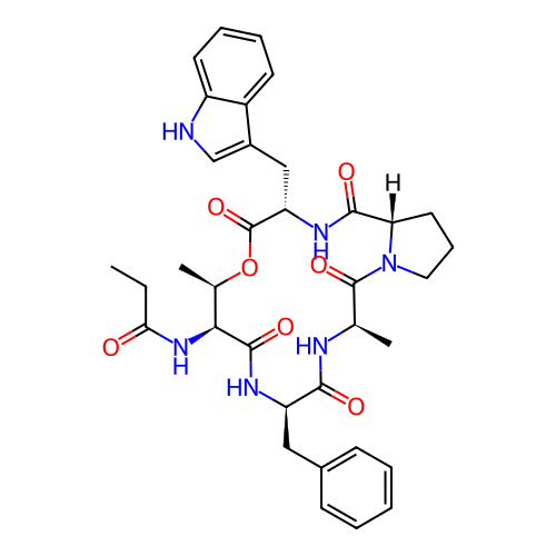 | InChI | InChI=1S/C35H42N6O7/c1-4-29(42)40-30-21(3)48-35(47)27(18-23-19-36-25-14-9-8-13-24(23)25)39-32(44)28-15-10-16-41(28)34(46)20(2)37-31(43)26(38-33(30)45)17-22-11-6-5-7-12-22/h5-9,11-14,19-21,26-28,30,36H,4,10,15-18H2,1-3H3,(H,37,43)(H,38,45)(H,39,44)(H,40,42)/t20-,21-,26-,27+,28+,30+/m1/s1 |