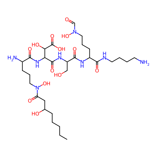 | SMILES | CCCCCC(CC(=O)N(CCCC(C(=O)NC(C(C(=O)O)O)C(=O)NC(CO)C(=O)NC(CCCN(C=O)O)C(=O)NCCCCN)N)O)O |