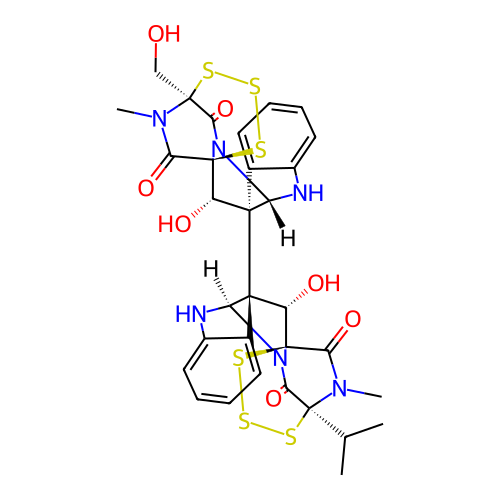 | SMILES | CC(C)[C@]12C(=O)N3[C@@H]4[C@]([C@@H]([C@@]3(C(=O)N1C)SSS2)O)(C5=CC=CC=C5N4)[C@@]67[C@@H]([C@]89C(=O)N([C@](C(=O)N8[C@@H]6NC1=CC=CC=C71)(SSS9)CO)C)O |