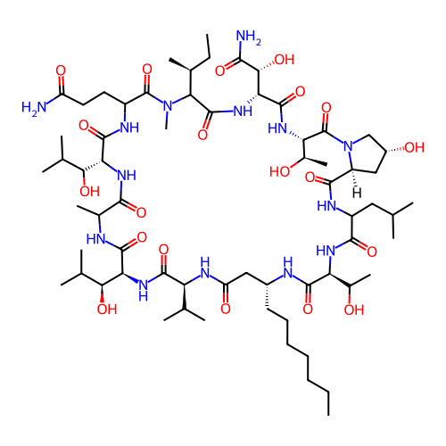 | SMILES | CCCCCCC[C@@H]1CC(=O)N[C@H](C(=O)N[C@H](C(=O)NC(C(=O)N[C@@H](C(=O)NC(C(=O)N(C(C(=O)N[C@@H](C(=O)N[C@H](C(=O)N2C[C@@H](C[C@H]2C(=O)NC(C(=O)N[C@H](C(=O)N1)C(C)O)CC(C)C)O)[C@@H](C)O)[C@H](C(=O)N)O)[C@@H](C)CC)C)CCC(=O)N)C(C(C)C)O)C)[C@H](C(C)C)O)C(C)C |