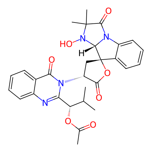 | InChI | InChI=1S/C29H30N4O7/c1-15(2)22(39-16(3)34)23-30-19-12-8-6-10-17(19)24(35)31(23)21-14-29(40-25(21)36)18-11-7-9-13-20(18)32-26(29)33(38)28(4,5)27(32)37/h6-13,15,21-22,26,38H,14H2,1-5H3/t21-,22+,26+,29+/m1/s1 |