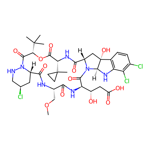 | SMILES | CC1(CC1)[C@@H]2C(=O)O[C@H](C(=O)N3[C@@H](C[C@H](CN3)Cl)C(=O)N[C@H](C(=O)N[C@@H](C(=O)N4[C@@H](C[C@@]5([C@H]4NC6=C5C=CC(=C6Cl)Cl)O)C(=O)N2)[C@H](CC(=O)O)O)COC)C(C)(C)C |