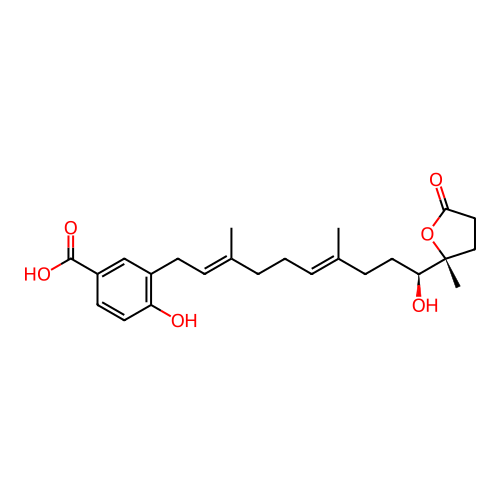 | InChI | InChI=1S/C24H32O6/c1-16(7-9-18-15-19(23(28)29)10-11-20(18)25)5-4-6-17(2)8-12-21(26)24(3)14-13-22(27)30-24/h6-7,10-11,15,21,25-26H,4-5,8-9,12-14H2,1-3H3,(H,28,29)/b16-7+,17-6+/t21-,24+/m0/s1 |