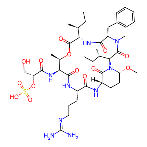 | SMILES | CC[C@H](C)[C@H]1C(=O)O[C@@H]([C@@H](C(=O)N[C@H](C(=O)N[C@H]2CC[C@H](N(C2=O)[C@H](C(=O)N([C@H](C(=O)N1)CC3=CC=CC=C3)C)[C@@H](C)CC)OC)CCCN=C(N)N)NC(=O)[C@@H](CO)OS(=O)(=O)O)C |