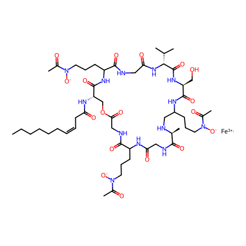 | SMILES | CCCCCC/C=C\CC(=O)N[C@H]1COC(=O)CNC(=O)C(NC(=O)CNC(=O)[C@@H](NCC(NC(=O)[C@@H](NC(=O)[C@H](NC(=O)CNC(=O)C(NC1=O)CCCN(C(=O)C)[O-])C(C)C)CO)CCCN(C(=O)C)[O-])C)CCCN(C(=O)C)[O-].[Fe+3] |