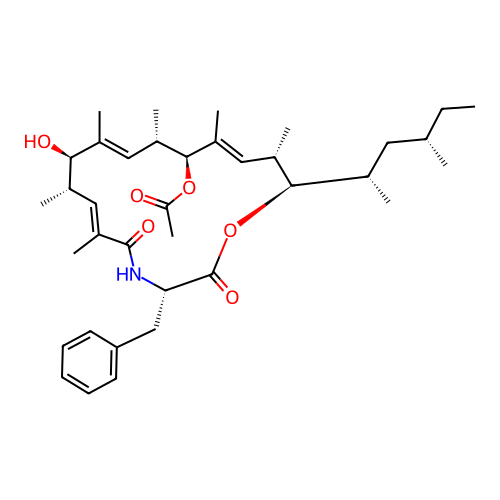 | SMILES | CC[C@H](C)C[C@H](C)[C@@H]1[C@H](/C=C(/[C@H]([C@H](/C=C(/[C@@H]([C@H](/C=C(/C(=O)N[C@H](C(=O)O1)CC2=CC=CC=C2)\C)C)O)\C)C)OC(=O)C)\C)C |