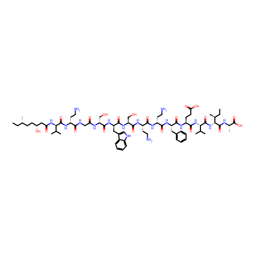 | SMILES | CC[C@H](C)CC[C@H](CC(=O)N[C@H](C(C)C)C(=O)N[C@H](CCN)C(=O)NCC(=O)N[C@H](CO)C(=O)N[C@H](CC1=CNC2=CC=CC=C21)C(=O)N[C@@H](CO)C(=O)N[C@@H](CCN)C(=O)N[C@H](CCN)C(=O)N[C@@H](CC3=CC=CC=C3)C(=O)N[C@@H](CCC(=O)O)C(=O)N[C@@H](C(C)C)C(=O)N[C@H]([C@@H](C)CC)C(=O)N[C@@H](C)C(=O)O)O |