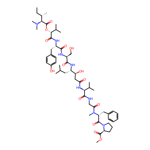 | InChI | InChI=1S/C56H86N8O14/c1-13-35(8)48(62(9)10)56(76)78-49(34(6)7)53(73)59-40(27-37-21-23-38(66)24-22-37)50(70)60-41(31-65)51(71)58-39(26-32(2)3)44(67)29-45(68)61-47(33(4)5)52(72)57-30-46(69)63(11)43(28-36-18-15-14-16-19-36)54(74)64-25-17-20-42(64)55(75)77-12/h14-16,18-19,21-24,32-35,39-44,47-49,65-67H,13,17,20,25-31H2,1-12H3,(H,57,72)(H,58,71)(H,59,73)(H,60,70)(H,61,68)/t35-,39-,40-,41-,42-,43+,44-,47-,48-,49+/m0/s1 |
