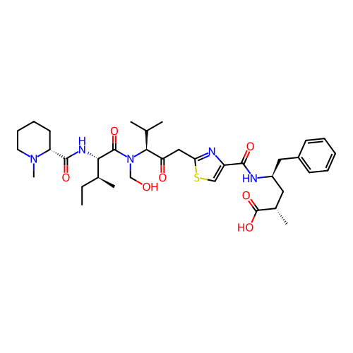 | InChI | InChI=1S/C36H53N5O7S/c1-7-23(4)31(39-34(45)28-15-11-12-16-40(28)6)35(46)41(21-42)32(22(2)3)29(43)19-30-38-27(20-49-30)33(44)37-26(17-24(5)36(47)48)18-25-13-9-8-10-14-25/h8-10,13-14,20,22-24,26,28,31-32,42H,7,11-12,15-19,21H2,1-6H3,(H,37,44)(H,39,45)(H,47,48)/t23-,24-,26+,28+,31-,32-/m0/s1 |