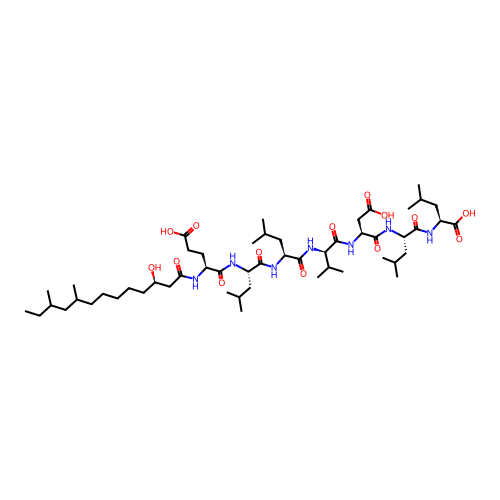 | SMILES | CCC(C)CC(C)CCCCC[C@H](CC(=O)N[C@@H](CCC(=O)O)C(=O)N[C@@H](CC(C)C)C(=O)N[C@@H](CC(C)C)C(=O)N[C@H](C(C)C)C(=O)N[C@@H](CC(=O)O)C(=O)N[C@@H](CC(C)C)C(=O)N[C@@H](CC(C)C)C(=O)O)O |
