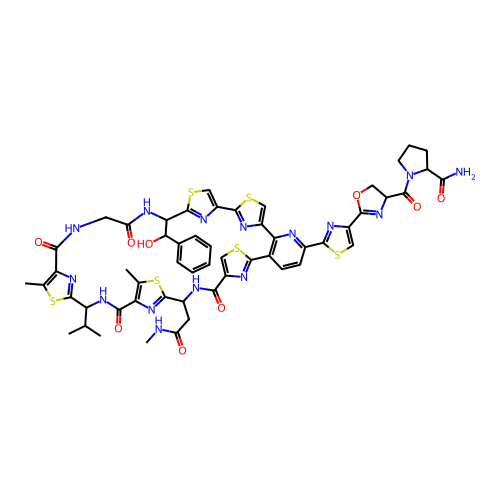 | InChI | InChI=1S/C55H53N15O9S6/c1-23(2)38-54-69-39(24(3)85-54)46(76)58-17-37(72)66-42(43(73)26-10-7-6-8-11-26)53-65-34(22-83-53)51-62-31(19-81-51)41-27(49-63-32(20-80-49)45(75)60-29(16-36(71)57-5)52-68-40(25(4)84-52)47(77)67-38)13-14-28(59-41)50-64-33(21-82-50)48-61-30(18-79-48)55(78)70-15-9-12-35(70)44(56)74/h6-8,10-11,13-14,19-23,29-30,35,38,42-43,73H,9,12,15-18H2,1-5H3,(H2,56,74)(H,57,71)(H,58,76)(H,60,75)(H,66,72)(H,67,77) |
