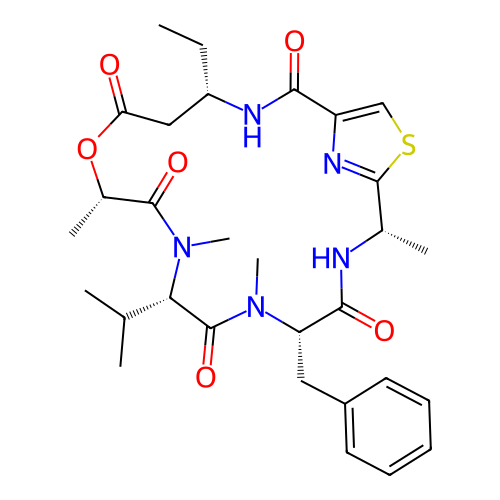 | InChI | InChI=1S/C30H41N5O6S/c1-8-21-15-24(36)41-19(5)29(39)35(7)25(17(2)3)30(40)34(6)23(14-20-12-10-9-11-13-20)27(38)31-18(4)28-33-22(16-42-28)26(37)32-21/h9-13,16-19,21,23,25H,8,14-15H2,1-7H3,(H,31,38)(H,32,37)/t18-,19-,21-,23-,25-/m0/s1 |