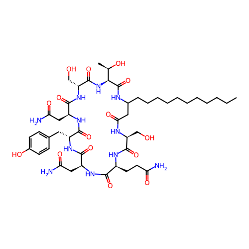 | SMILES | CCCCCCCCCCCC1CC(=O)N[C@H](C(=O)N[C@H](C(=O)N[C@H](C(=O)N[C@@H](C(=O)N[C@H](C(=O)N[C@@H](C(=O)N[C@H](C(=O)N1)[C@@H](C)O)CO)CC(=O)N)CC2=CC=C(C=C2)O)CC(=O)N)CCC(=O)N)CO |