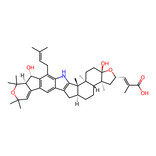 | InChI | InChI=1S/C43H57NO6/c1-22(2)11-13-26-32-27(30-21-38(4,5)50-39(6,7)33(30)35(32)45)19-28-29-18-24-12-14-31-40(8,42(24,10)36(29)44-34(26)28)15-16-43(48)41(31,9)20-25(49-43)17-23(3)37(46)47/h11,17,19,21,24-25,31,33,35,44-45,48H,12-16,18,20H2,1-10H3,(H,46,47)/b23-17+/t24-,25+,31+,33+,35+,40-,41-,42+,43-/m0/s1 |