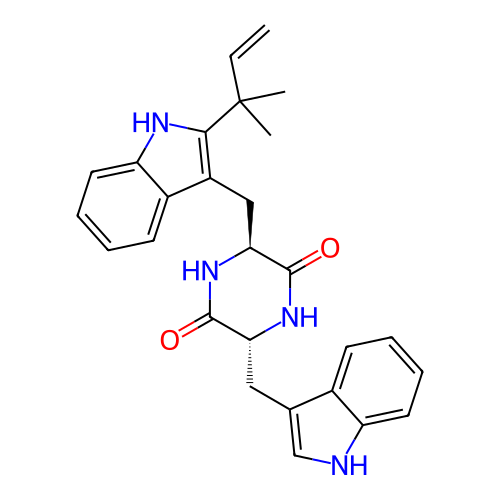 | SMILES | CC(C)(C=C)C1=C(C2=CC=CC=C2N1)C[C@H]3C(=O)N[C@@H](C(=O)N3)CC4=CNC5=CC=CC=C54 |