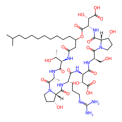 | SMILES | CC(C)CCCCCCCCCC1CC(=O)N[C@H]([C@@H](C)O)C(=O)N[C@H](C)C(=O)N2CC[C@@H](O)[C@H]2C(=O)N[C@@H](CCCN=C(N)N)C(=O)N[C@H]([C@@H](O)C(=O)O)C(=O)N[C@H](CO)C(=O)N2CC[C@@H](O)[C@H]2C(=O)N[C@@H]([C@H](O)C(=O)O)C(=O)O1 |