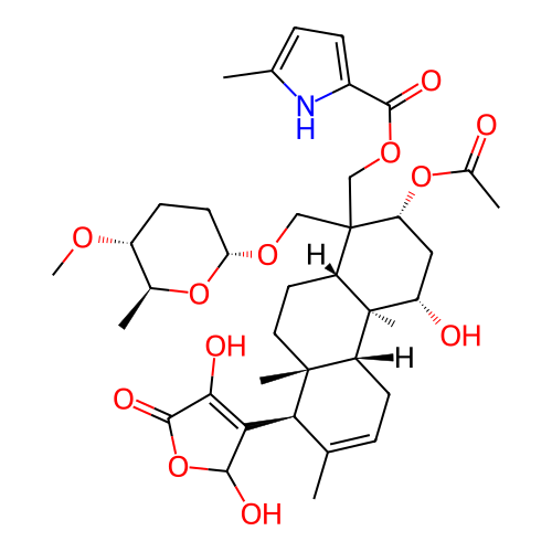 | InChI | InChI=1S/C38H53NO12/c1-19-8-12-25-36(5,31(19)30-32(42)35(45)51-34(30)44)15-14-26-37(25,6)27(41)16-28(50-22(4)40)38(26,18-48-33(43)23-10-9-20(2)39-23)17-47-29-13-11-24(46-7)21(3)49-29/h8-10,21,24-29,31,34,39,41-42,44H,11-18H2,1-7H3/t21-,24+,25+,26-,27-,28+,29+,31-,34?,36+,37-,38?/m0/s1 |