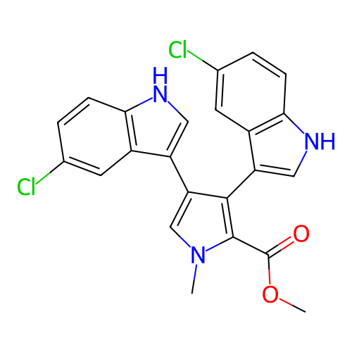 | SMILES | CN1C=C(C(=C1C(=O)OC)C2=CNC3=C2C=C(C=C3)Cl)C4=CNC5=C4C=C(C=C5)Cl |
