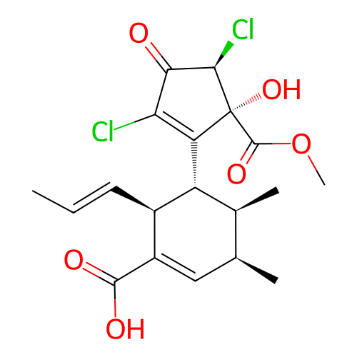 | SMILES | C/C=C/[C@H]1[C@@H]([C@H]([C@H](C=C1C(=O)O)C)C)C2=C(C(=O)[C@H]([C@]2(C(=O)OC)O)Cl)Cl |