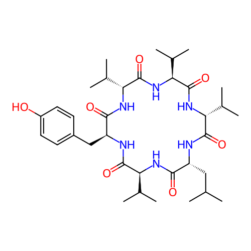 | InChI | InChI=1S/C35H56N6O7/c1-17(2)15-24-30(43)38-26(18(3)4)32(45)37-25(16-22-11-13-23(42)14-12-22)31(44)39-28(20(7)8)34(47)41-29(21(9)10)35(48)40-27(19(5)6)33(46)36-24/h11-14,17-21,24-29,42H,15-16H2,1-10H3,(H,36,46)(H,37,45)(H,38,43)(H,39,44)(H,40,48)(H,41,47)/t24-,25+,26+,27-,28-,29+/m1/s1 |