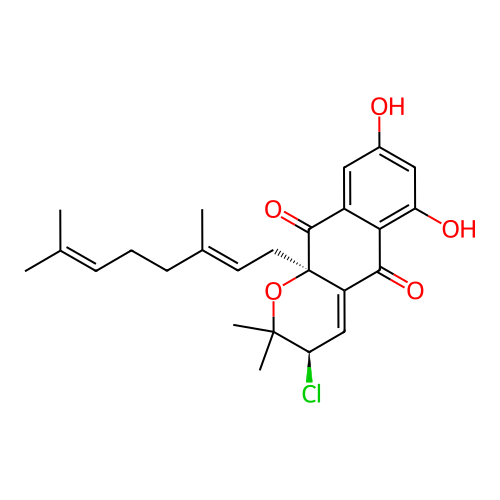 | InChI | InChI=1S/C25H29ClO5/c1-14(2)7-6-8-15(3)9-10-25-18(13-20(26)24(4,5)31-25)22(29)21-17(23(25)30)11-16(27)12-19(21)28/h7,9,11-13,20,27-28H,6,8,10H2,1-5H3/t20-,25-/m1/s1 |