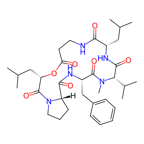 | SMILES | CC(C)C[C@H]1C(=O)NCCC(=O)O[C@H](C(=O)N2CCC[C@H]2C(=O)N[C@H](C(=O)N([C@H](C(=O)N1)C(C)C)C)CC3=CC=CC=C3)CC(C)C |